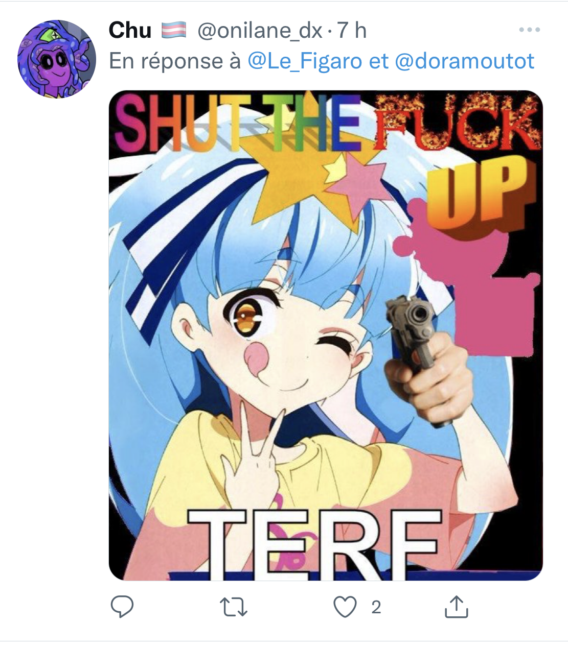“Une Terf une balle marguerite une rafale” / “Ne te pointe pas à la manif d’aujourd’hui si tu ne veux pas recevoir du sperme de meuf trans dans la tronche” / “Cela ne tiendrais qu’à moi, ce serait une balle pour elle” /“Si vous voulez pas qu’on aie envie de vous péter les genoux” / Un jour très proche je pense, des trans vont aller fracasser des Terfs….”