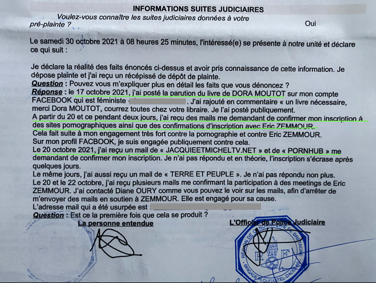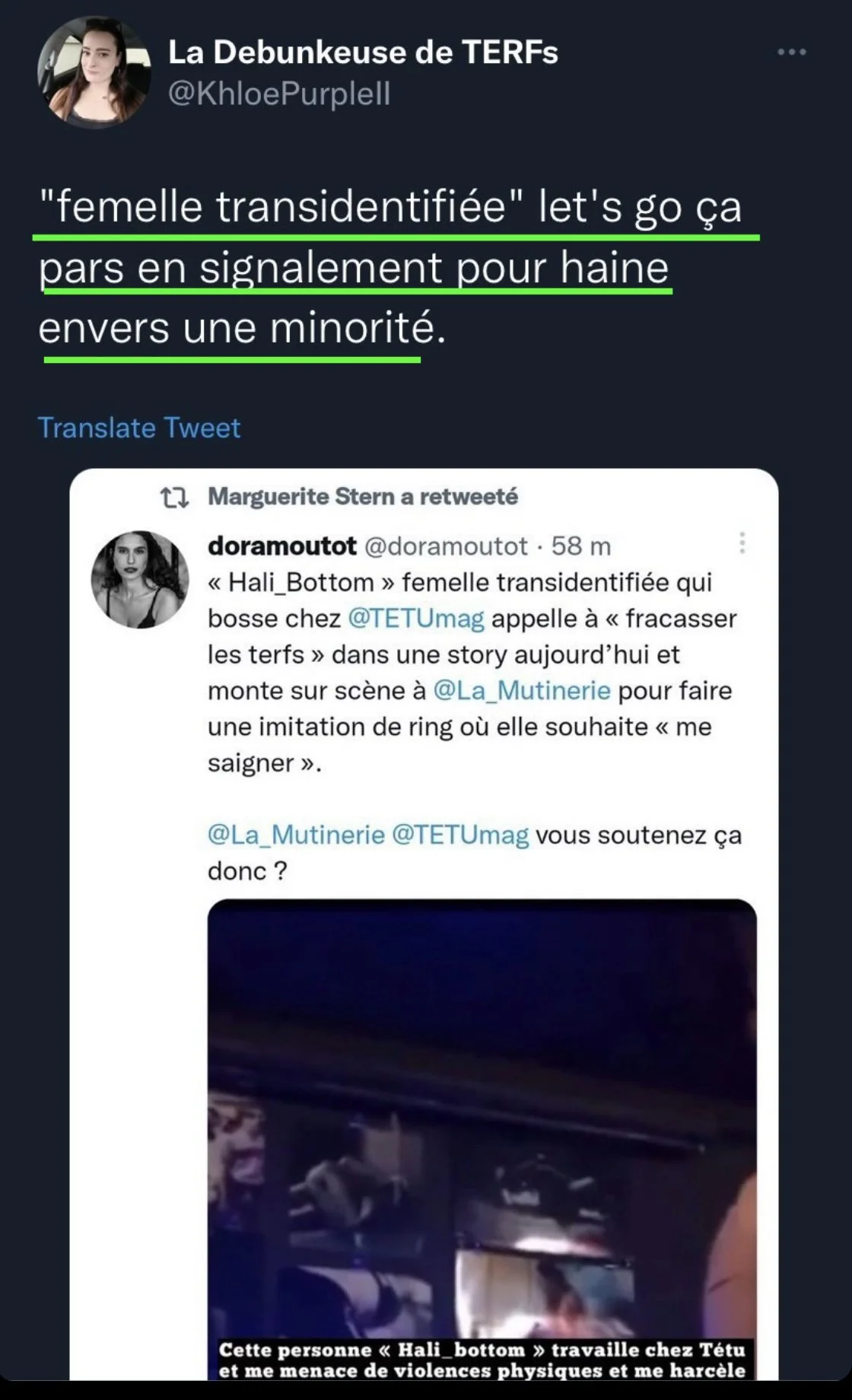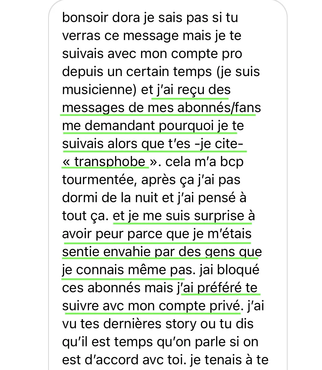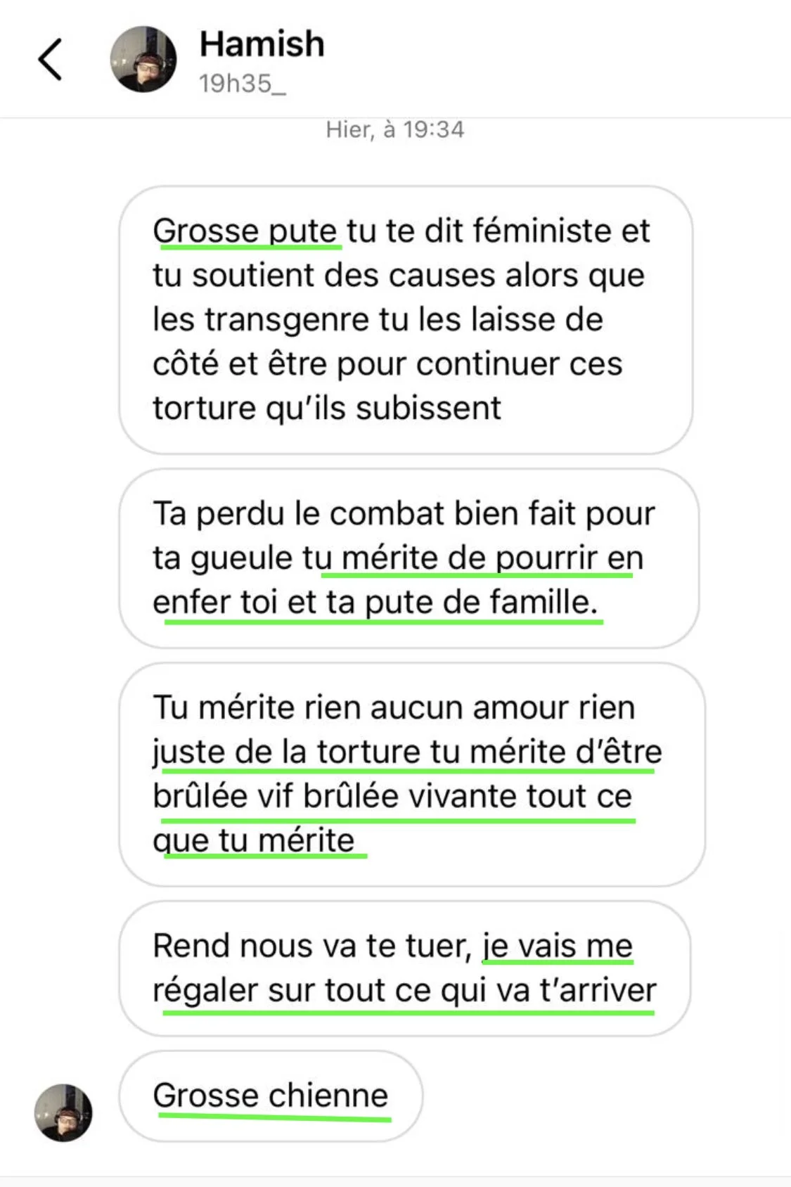 Les transgenristes harcèlent aussi les gens qui nous suivent sur les réseaux. Ils envoient régulièrement des messages privés à ces personnes, dans le but de les informer sur notre soi-disant “transphobie”. Ils leur demandent parfois de se justifier de nous suivre et les invitent à ne plus le faire, sous peine de représailles. Un des followers de Dora Moutot a du porter plainte pour harcèlement suite au fait d’avoir partagé des contenus de Dora sur sa page Facebook.