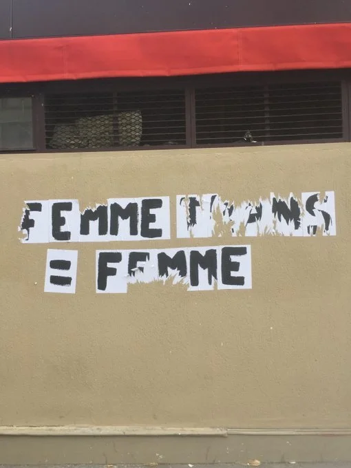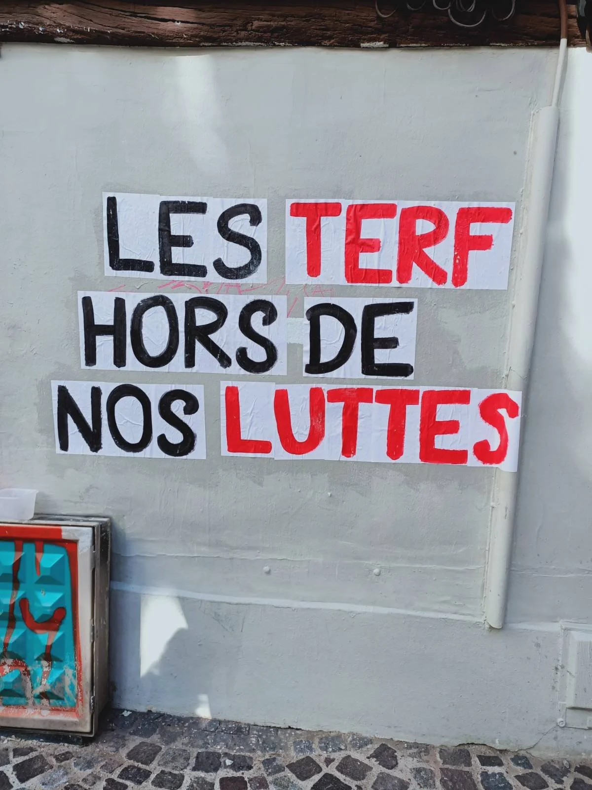 Dans la rue, les transgenristes inscrivent des menaces de mort envers “les TERFs”. Or, les “TERFs” sont très clairement identifiées en France. Certains graffitis ou pancartes sont cependant nominatifs et nous désignent encore plus directement.