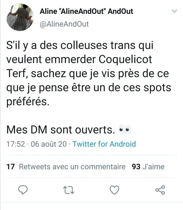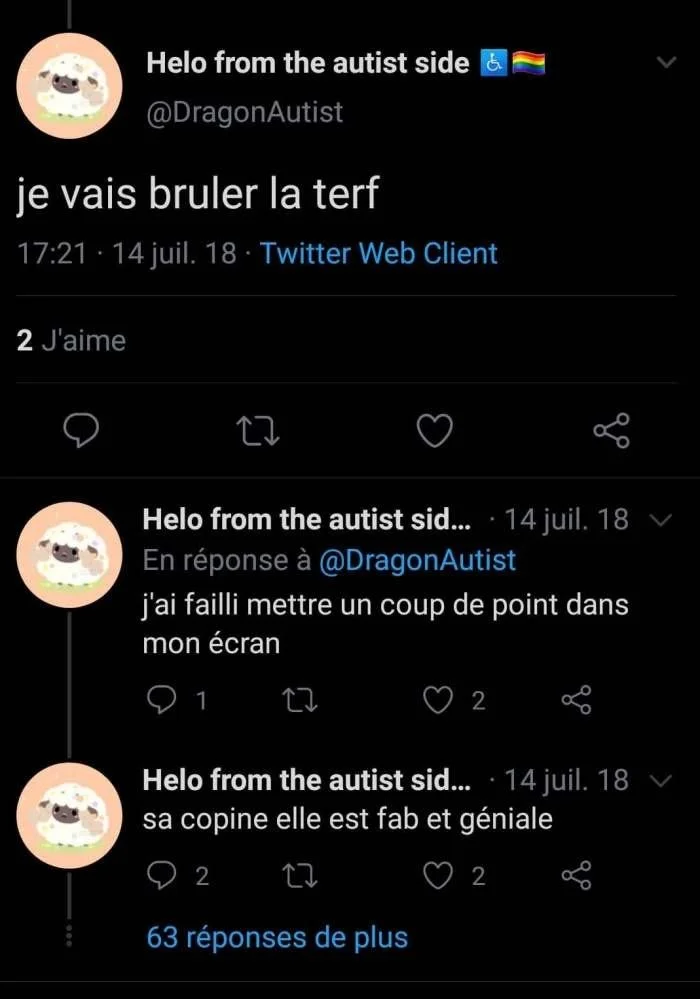 Le parasitage s’étend même en dehors de la sphère féministe. Les transgenristes vont jusqu’à harceler Dora Moutot sous tous les contenus sur le sujet de sa maladie intestinale, dans la section commentaire de divers médias, afin de la discréditer partout.